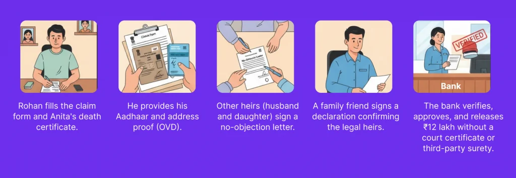 Let’s say Anita Sharma had a savings account with ₹12 lakh but passed away without naming a nominee. Her son, Rohan, approaches the bank.